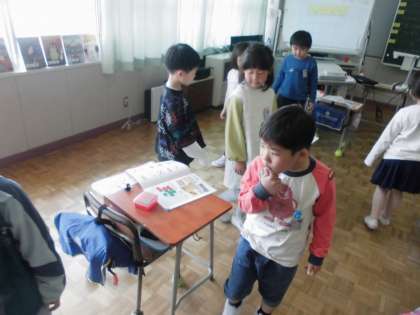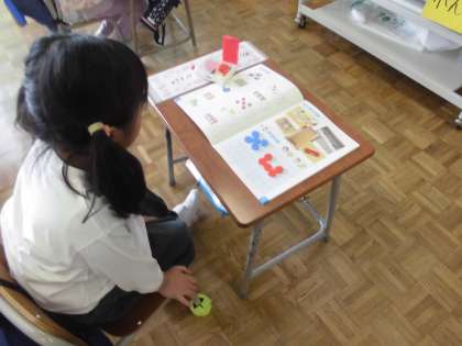 1年生の4時間目は、算数の学習でした。おはじきを使って、いろいろな並べ方を考えました。並べた後は、友達と見合う時間をとりました。
