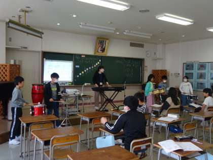 6年生は様々な楽器でリズム打ちをしていました。自分で選んだ楽器で、曲に合わせて演奏することもできました。