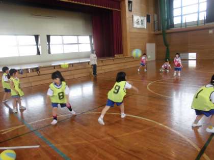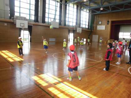 1、2年生の3時間目は、体育の学習でした。ペアやグループの友達とボールを投げ合ったり、2つのグループに分かれてドッジボールをしたりしました。