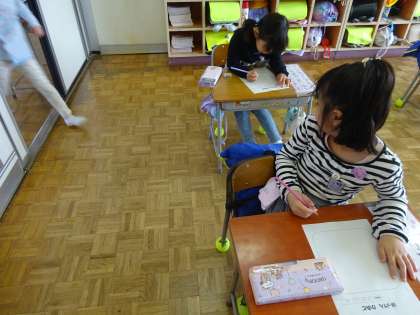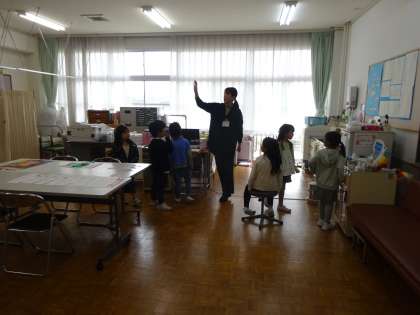 1年生は生活科で保健室の探検をしていました。保健の先生に質問しながら、保健室の中を見て回り、見付けたものを「はっけんカード」に描いていました。