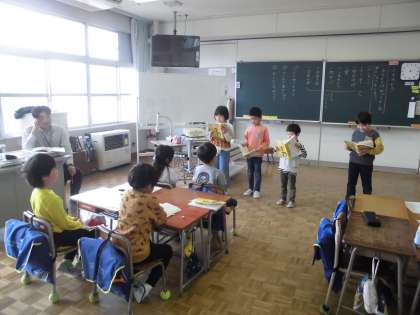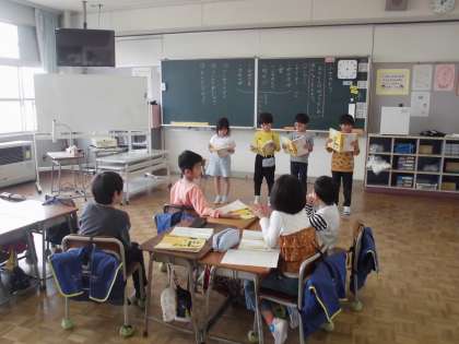 2年生の5時間目は、国語の学習でした。「ふきのとう」のお話から想像したことを基に音読の仕方を工夫しました。発表会後は、互いによかったところ等を伝え合っていました。