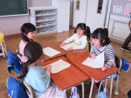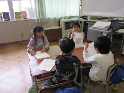 1年生は学校探検で見付けたものを、グループごとに紹介していました。絵を見せながら紹介したり、友達の発見に拍手をしたりと、話す子供も聞く子供も楽しんでいました。