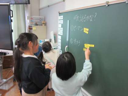 3年生は自分たちで育てる野菜の話をしてました。ピーマン、オクラから育てたい野菜を選ん種の観察をしました。実際に物差しで大きさを測たり、形を「〜みたい」と例えたりと、いろいろな観点から観察していました。