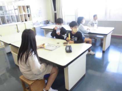 6年生の2時間目は、理科の学習でした。気体検知管や石灰水を使って、空気中の酸素や二酸化炭素の割合を調べました。