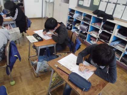 5年生の5時間目は、算数の学習でした。直方体の体積を計算で求めていました。かけ算を間違えないように慎重に解いていました。