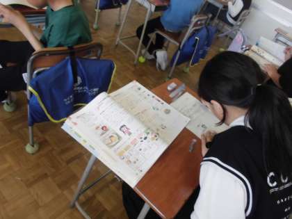 6年生の3時間目は、家庭科の学習でした。食品の3つのグループと細かく6つに分けられる食品群を調べ、プリントにまとめました。