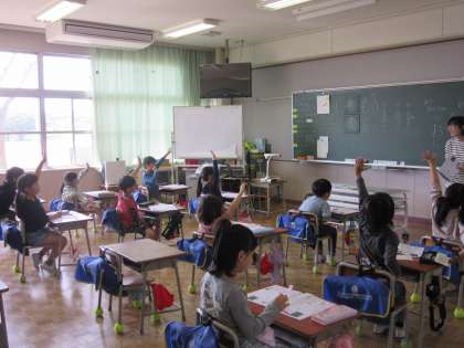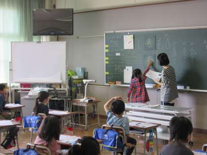1年生は国語科でひらがなの練習をしています。先生が書いたひらがなの間違いを探しながら、正しいひらがなの形を学んでいました。