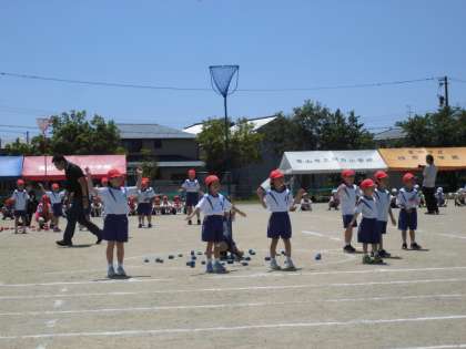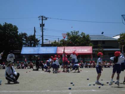 1〜3年生の団体競技「ダンス玉入れ」では、音楽のリズムに乗ってかわいく、かっこよく踊りました。途中の玉入れも、高くなったかごにめがけて、一生懸命投げていました。