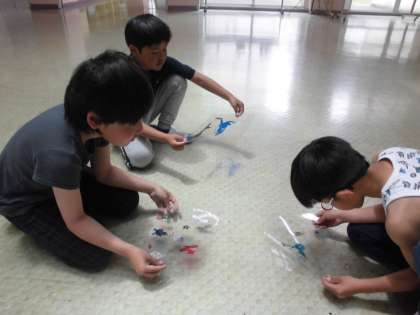 2年生の4時間目は、図工の学習でした。透明シートにペンで絵をかいたり、色シールを貼ったりした後、光に当て、床に映し出しました。「きれいだね」「もっと色を濃くするとはっきりと色が分かるかな」「透明シートを丸めてみよう」等、会話しながら、光のプレゼントを楽しんでいました。