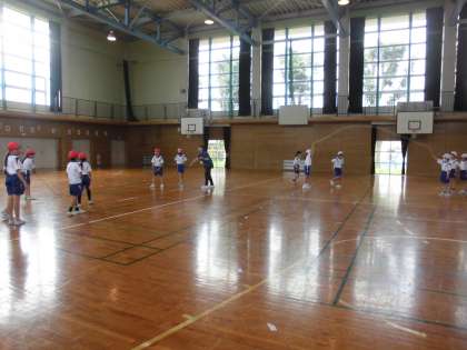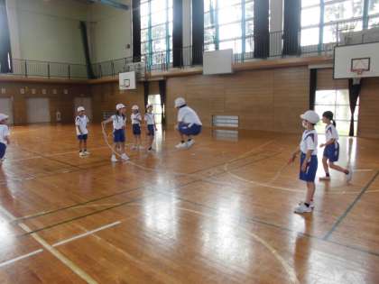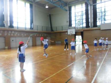 4年生の2時間目は、体育の学習でした。後半には、団ごとに長なわの八の字跳びを練習していました。跳ぶ場所や回し方等、互いに声をかけ合いながら運動していました。