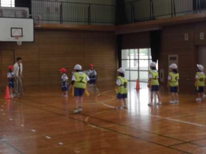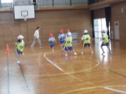タグ取り鬼ごっこの後に、今日は試しのゲームをしました。ルールを知り、今日は守り(敵)にタグを取られないように宝(お手玉)を運ぶにはどうずればよいかを考えてながらゲームをしていました。