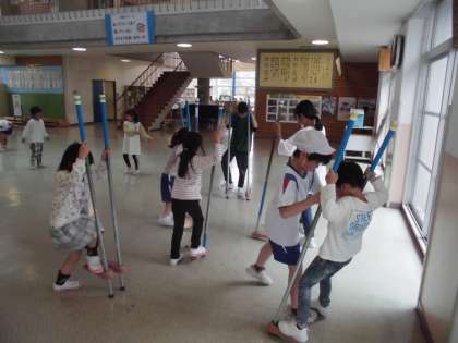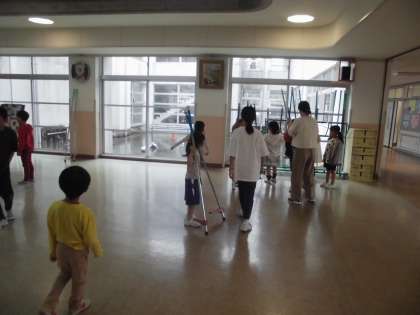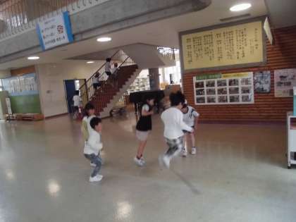 今日はあいにくの雨模様なので、室内で過ごす四方っ子です。コモンスペースでは、竹馬に挑戦する下学年に上学年が優しく教えている姿が見られました。