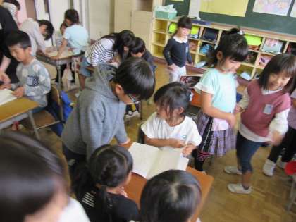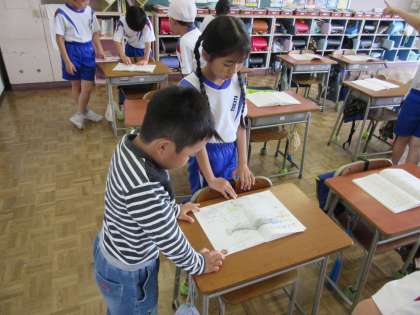 全校で自学ノート交流会を行いました。低・中・高の学年でお互いに家庭学習がんばり週間等で取り組んだ自主学習ノートを紹介し合いました。学習の内容を紹介してもらったり、見付けたよさを付箋に書いて伝えたりしながら、これからの学習に生かしていこうと熱心に見ていました。