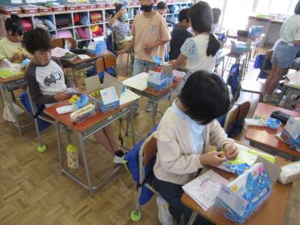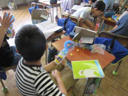 4年生は理科で、電流のはたらきについて調べてます。電池でファンを回すために、どのようにつないだらよいか考えながら活動しています。