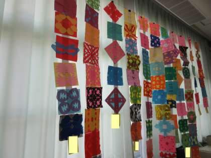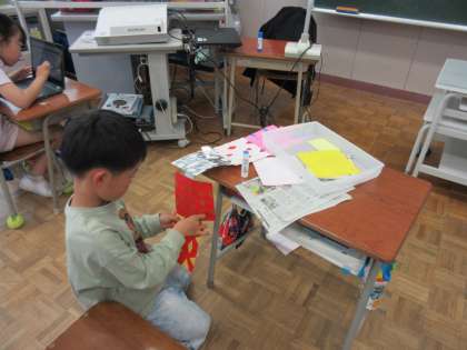 1年生は図画工作科ではさみと折り紙で飾りをつくっています。色の組み合わせも考えて素敵な飾りをつくりました。
