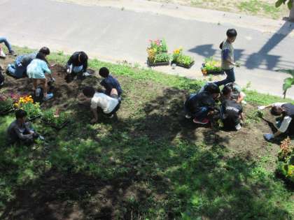 5年生は理科の授業で育てていたインゲンマメを畑に植え直しました。「大きくなってくれるといいな」と言いながら、植えていました。また、花苗を植える花壇の準備もしていました。素敵な花壇ができあがるのが楽しみです。