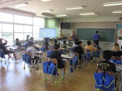 6年生は外国語の学習で、「N」の発音を練習していました。「N」の付く単語を聞き分ける問題では、似たような発音の単語があり、迷いながらも真剣に聞いていました。