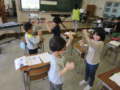 3年生は音楽科で、童歌の学習をしています。「茶つみ」の歌に合わせて手を打ち合いながら、笑顔で曲を楽しんでいました。