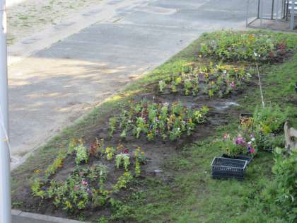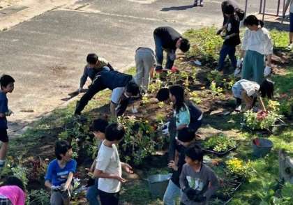 5年生が花壇に花の苗を植えていました。自分たちで考えたレイアウトで花を植えています。花壇が一気に色鮮やかになりました。