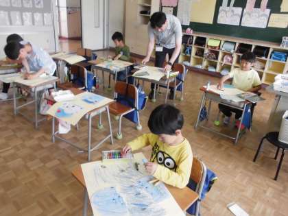 2年生の2時間目は、図画工作科の学習でした。オリジナルの卵から、何が飛び出してくるかを想像しながら、大きな画用紙いっぱいに描いていました。
