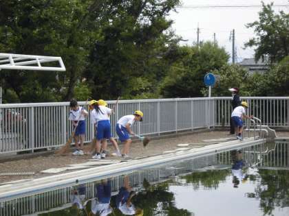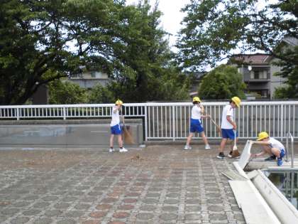 4年生は3時間目に、プールの溝やプールサイドの掃除をしました。プールの溝に溜まった落ち葉や泥を取り除くのに苦労していましたが、進んで仕事を見付け、掃除をする4年生です。来週、5・6年生が本格的に掃除をします。