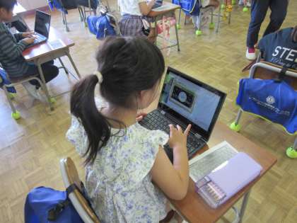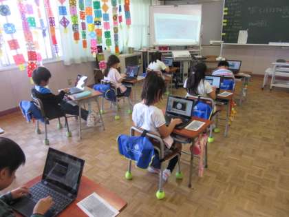 1年生は、パソコンでタイピング練習をしていました。ローマ字はまだ分かりませんが、どのキーをたたくと「あいうえお」「かきくけこ」になるのか、印をつけたキーボードの写真をたよりに、タイピングゲームにチャレンジしていました。