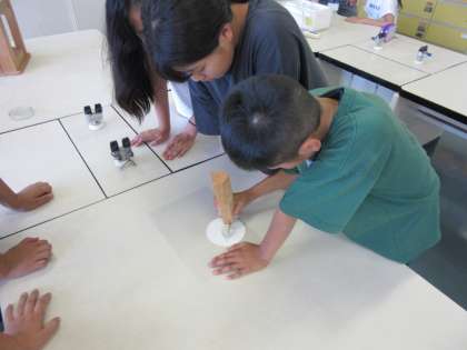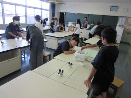 6年生は理科で、植物のからだのはたらきについて学習しています。今日は、日光の当たった葉にデンプンができているかを調べる実験です。ヨウ素溶液の反応が見やすくなるよう