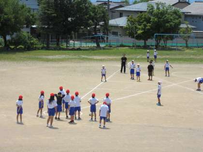 5年生は、練習の成果を発揮するべく、ソフトボール投げの記録を計測していました。「おー!すごい」「もっと上に向かって投げたらいいよ」感嘆や応援の声が多く聞かれました。