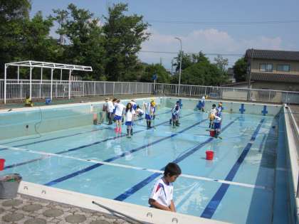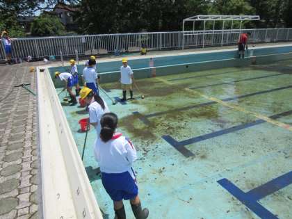 6年生がプール開きに向けて、プール清掃を行いました。暑い中でしたが、6年生のがんばりによってプールがとてもきれいになりました。
