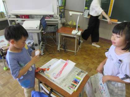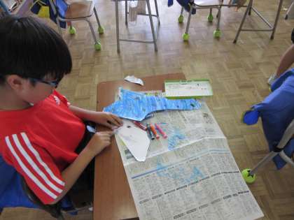 1年生は図画工作科で、画用紙を自由に破って、破った形から想像を広げて作品をつくりました。動物に見えたり、食べ物に見えたり、やぶった画用紙が子供たちの想像力でいろいろなものに変身しました。