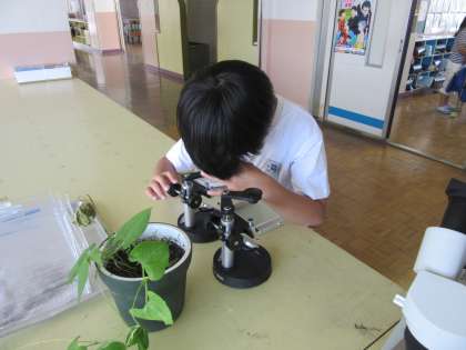 5年生は理科でメダカの成長を学習しています。廊下に解剖顕微鏡とメダカの卵が常においてあり、子供たちは休み時間も気にして卵の様子をのぞいています。