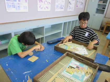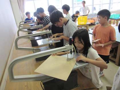 5年生は図画工作科で糸のこを使って製作活動をしています。1枚の板を、ぎざぎざ、なみなみ等いろいろな形に切り抜き、組み合わせ、試行錯誤しながら素敵な作品になるようがんばっています。