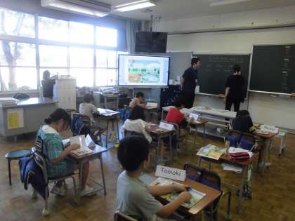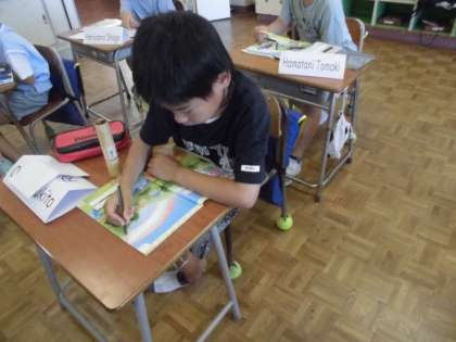3年生の2時間目は、外国語活動でした。色の言い方を覚えたり、自分のオリジナルの虹を描いたりしました。普段、聞き慣れている言い方と違う表現に、子供たちも驚いていました。