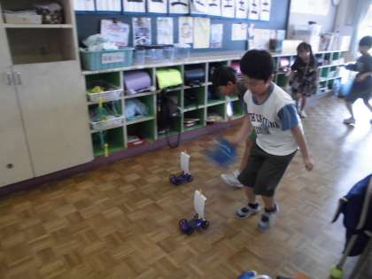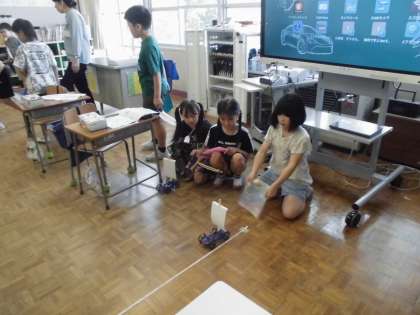 3年生の1時間目は、理科の学習でした。帆を張った車を走らせるには、どの辺りに風を当てればよいか、風の力の違いで車の進む距離が違うのか等、友達と一緒に確かめていました。
