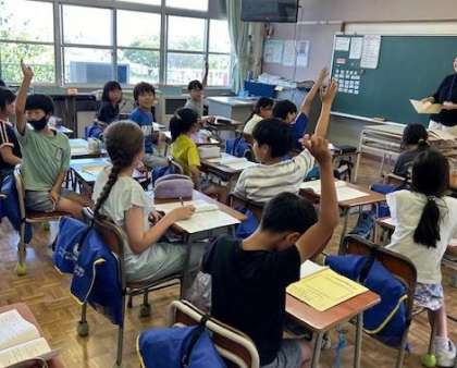 4年生は初めての宿泊学習について話をしていました。2段ベッドのどちらを使うか、どんな活動をするのか、今からワクワクしている様子です。