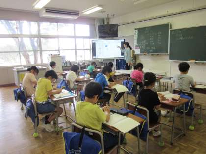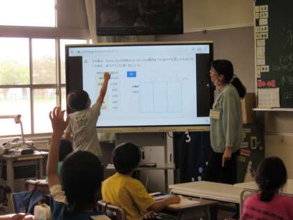 3年生は算数科でグラフと表の学習をしていました。デジタル教科書を活用することで、グラフの目盛りも共有しやすく、より確実な理解につながっています。