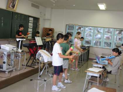 6年生は音楽科で「Paradise has no border」という曲の合奏をしていました。コマーシャル等でもよく耳にする曲で、「理想のテンポ」で「ノリノリ」で「楽しく」合奏することを目当てにどの子も練習をがんばっています。