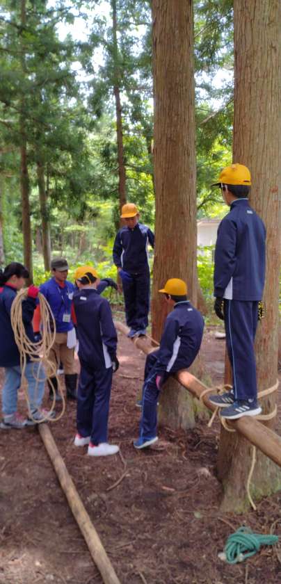 丸太で作った土台ができ、試しに乗ってみる班も出てきました。