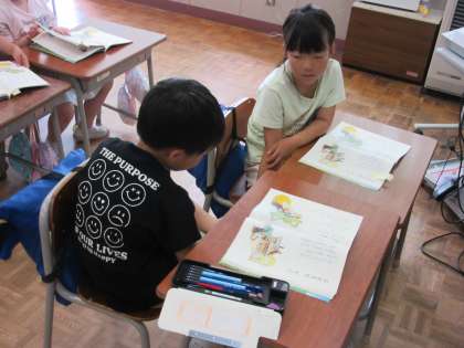 1年生は国語科で「おおきなかぶ」の学習をしていました。おじいさんがどんなかぶ、どのくらいの大きさのかぶになってほしいと思っていたのか、ペアの友達と話し合っていました。教科書を指さして理由を話したり、実際に手を動かして大きさを表現し合ったりしていました。