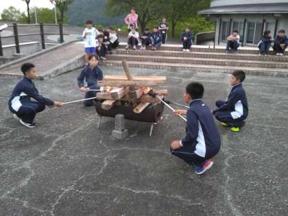 キャンプファイヤーが始まりました。校長先生から四つの火を分けていただき、しっかりと火を点けることができました。