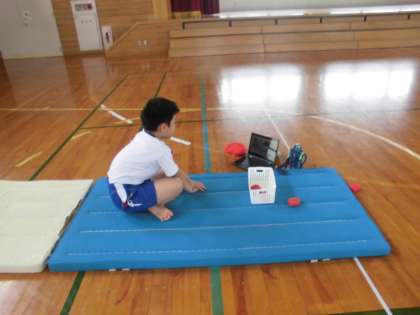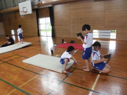 3年生の3時間目は、体育の学習でした。今日も、一人一人の課題に合わせて技を身に付けています。今日は、膝を真っ直ぐ伸ばして立つにはどうすればよいか、手を着く位置はどうか等を動画を撮って確認する子供たちが多かったです。