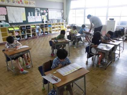 2年生の4時間目は、国語の学習でした。今日の新出漢字は、どの字も間違いやすいものばかりで、子供たちは手本をよく見ながら、一生懸命に学習していました。