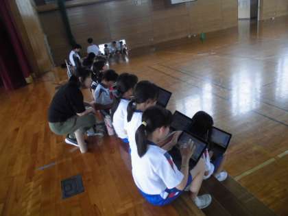 6年生の6時間目は、体育の学習でした。スポーツテストのシャトルランに取り組んでいました。90回以上の記録を出す子供、昨年度より15回以上増えた子供もいて、体力がついたことに喜びを感じていました。記録は、端末のアプリに入力しました。