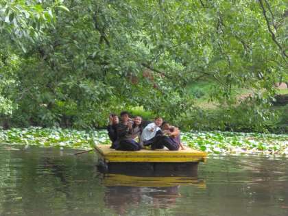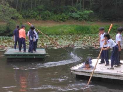 池遊びが始まりました。いかだ乗りでは、みんなでバランスを取りながら、上手に乗っています。