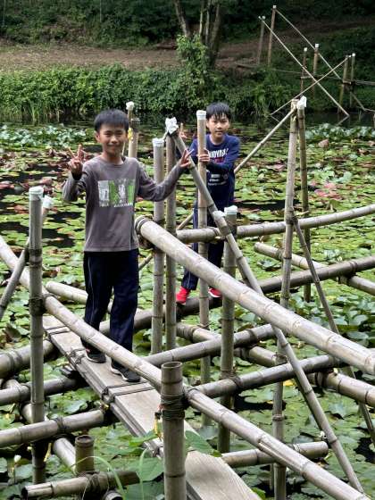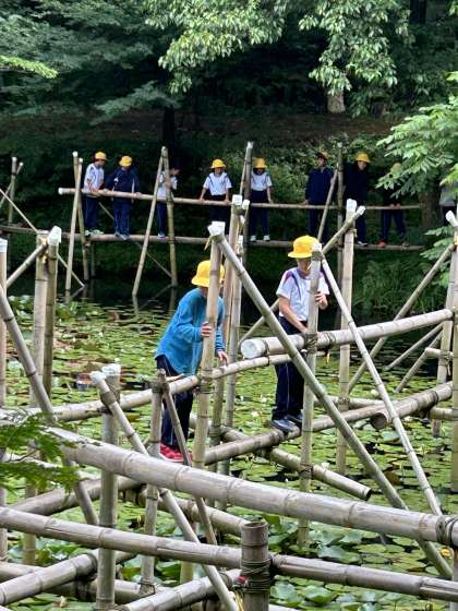 池ジャングルでは、池の上にある竹のジャングルを渡ります。みんな慎重に進んでいますが、渡り終わった後は嬉しそうです。