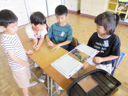 2年生は生活科で「いきものとなかよし」の学習をしています。えさやすみかについて自分たちで調べながら、虫を育てていますが、すみかがどんどんよくなり、虫たちも居心地が良さそうです。子供たちもすっかり虫たちとなかよしです。