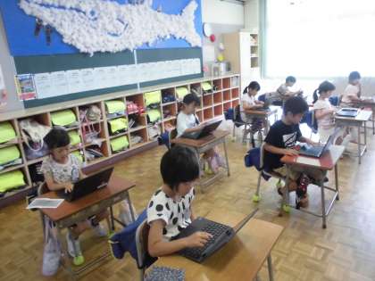 1年生の3時間目は、国語の学習でした。片仮名の学習をした後に、クロームブックで学習した片仮名を復習したり、タイピングの練習をしたりしていました。