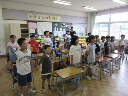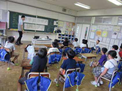 2、3年生は今年、連合音楽会に参加します。事前に子供たちからどんな歌を歌いたいかを聞いていました。「元気な曲」「明るい曲」という子供の思いから、2曲の歌を紹介しました。「おひさま」や「うちゅうじん」が出てくる楽しい曲に、子供たちは早速ワクワクしている様子です。今後、子供たちと目当てを立て、2、3年生で協力して練習に取り組みます。