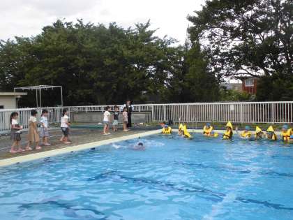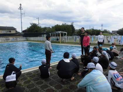 服をきたまま水の中に入ると、簡単に動けないことも体感したようです。5・6年生が体験している様子を1年生が見学に来ました。ペットボトルやライフジャケットの効果を知る機会となりました。最後に、代表の児童が「今日、教えていただいた方法を家族にも伝えたい」と思いを伝えました。