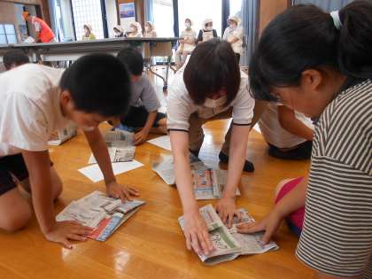 また、炊きあがるまでの時間を利用して、災害時に利用する新聞スリッパ作りも体験しました。